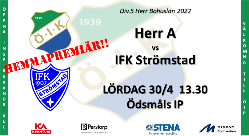 Välkomna till Ödsmåls IP för att ge ert stöd till våra herrar som gästas av IFK Strömstad i årets hemmapremiär!! Det är säsongens fjärde match och vi är fortfarande obesegrad med två vinster och en oavgjord. Gästande IFK Strömstad däremot kommer från tre raka vinster och det är dags att bryta denna segersvit och bygga vidare på att vi ska förbli obesegrade. Tid: Lördag 30 april 13.30 Plats: Ödsmåls IP Entréavgift: 60 kr Medlem och pensionär: 30 kr 0-16 år eller aktiva spelare i ÖIK: fri entré Vi vill påminna besökare till matchen som kommer med bil att åka förbi anläggningen och parkera på anvisad plats på vår grusplan! Följ skyltarna! Under lördagen pågår även en cykeltävling i området och därav extra viktigt att följa anvisningar för parkering!!