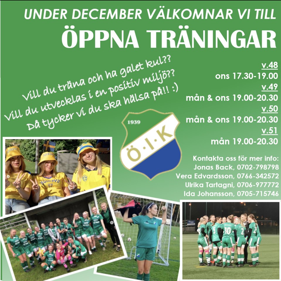 Vill du träna och ha galet kul? Vill du utvecklas i en positiv miljö? Vill du kunna kombinera fotboll med andra sporter eller skola? Vill du vara med på resan att i små steg skapa ett Damlag i Ödsmål? Kom isf och hälsa på oss i december! Vi lovar dig en skön träningsmiljö med utbildade tränare med fokus på glädje och utveckling. Där ALLA får speltid! 💚💙 Öppna träningar under december för F15+ Ons 1/12 17.30-19.00, Stora Höga Mån 6/12 19.00-20.30, Stora Höga Ons 8/12 19.00-20.30, Stora Höga Mån 13/12 19.00-20.30, Stora Höga Ons 15/12 19.00-20.30, Stora Höga Mån 20/12 19.00-20.30, Stora Höga Kontakta någon av oss för mer info! Jonas, 0702-798798 Vera, 0766-342572 Ulrika, 0706-977772 Ida, 0705-715746 Om ni är aktiva i annan förening så kräver vi att ni meddelar era ledare innan ni kommer på våra öppna träningar. Varmt välkomna till gemenskapen!! 💚💙 DELA och SPRID gärna denna info!! 👌 #ödsmålsik #tjejfotboll #provträna #alltidhakulihop #såmångasommöjligsålängesommöjligt