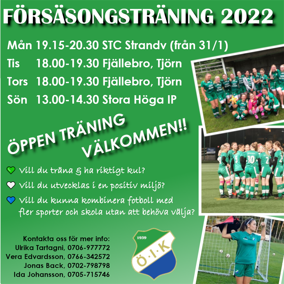 Ny säsong, nya träningar, nya ansikten 💚😊 Under januari/februari har vi följande träningstider och de är såklart öppna för alla från 15 år och uppåt, så välkommen provträna med oss!! 😊 Mån 19.15-20.30 STC Strandvägen (från 31/1) Tis 18.00-19.30 Fjällebro, Tjörn Tors 18.00-19.30 Fjällebro, Tjörn Sön 13.00-14.30 Stora Höga IP - Vill du träna & ha riktigt kul? - Vill du utvecklas i en positiv miljö? - Vill du kunna kombinera fotboll med andra sporter eller skolan utan att behöva välja? - Gillar du fika & glass? 🍧 - Du kanske är målvakt? Vad sägs om egen mv tränare?😁 - Du kanske har slutat men vill komma igång igen... Kom isf & hälsa på oss under 2022. Vi lovar dig en skön träningsmiljö med utbildade tränare med fokus på GLÄDJE & UTVECKLING. Och ALLA får speltid hos oss 💚 Kontakta någon av oss för mer info! Jonas, 0702-798798 Vera, 0766-342572 Ulrika, 0706-977772 Ida, 0705-715746 Om ni är aktiva i annan förening så kräver vi att ni meddelar era ledare innan ni kommer på våra öppna träningar. Varmt välkomna till gemenskapen!! 💚💙 DELA och SPRID gärna denna info!! 👌 #ödsmålsik #tjejfotboll #provträna #alltidhakulihop #såmångasommöjligtsålängesommöjligt