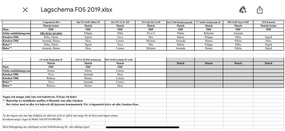 Hej! Här kommer säsongens kioskschema. Om ni inte kan på utsatt datum så byt med någon så snart som möjligt. Önskar er en fin söndag kväll! Hälsningar Malin, kioskansvarig