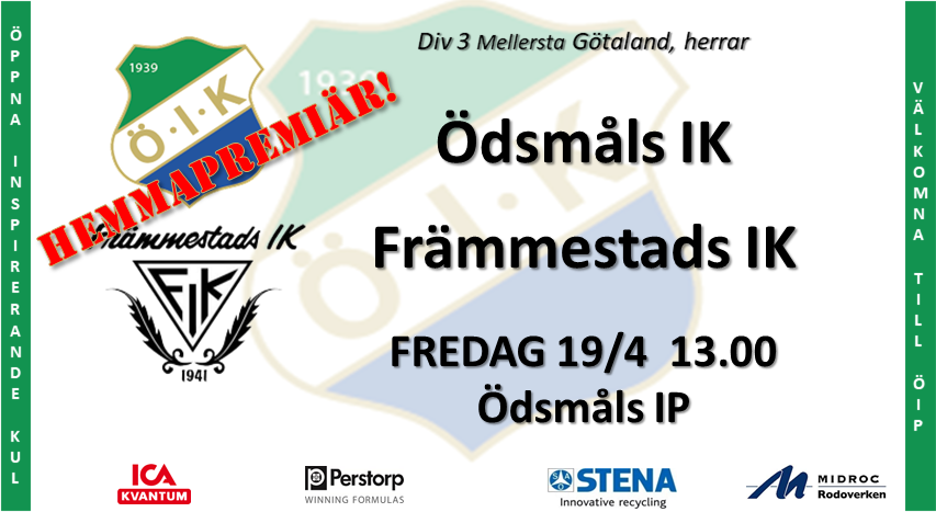 För första gången i föreningens historia välkomnar vi alla till ÖIP för hemmapremiären i div.3! Anläggningen är fint vårstädad och väderleksrapporten för långfredagen ser helt fantastisk ut! Kom till ÖIP och njut av fotboll i solen och heja fram våra krigare till första segern för denna säsong! I denna premiär gästas vi av Främmestads IK och vi önskar gästerna välkomna till vår vitgröna borg! Tid: Fredag 19 april 13.00 Plats: Ödsmåls IP Entréavgift: 60 kr Medlem och pensionär: 30 kr 0-16 år eller aktiva spelare i ÖIK: fri entré Premiären för herrarna spelades förra helgen borta mot Ardala GoIF och slutade oavgjort efter att laget hade ledningen både vid 1-0 och 2-1 men inte kunde försvara ledningen och fick bara med sig en pinne i bagaget på hemresan. En okej premiärmatch och faktum är att vår första poäng på denna nivå nu är bärgad. Kan kanske första trepoängaren komma mot Främmestad, vi hoppas det!! Matchrapport Ardala GoIF - Ödsmåls IK Främmestads IK kommer till ÖIP med en förlust i sin premiärmatch, hemma mot Ahlafors IF (1-3). Vi kan räkna med att det är ett revanschsuget lag som kliver ut på planen på fredag. Vi vill påminna besökare till matchen som kommer med bil att åka förbi anläggningen och parkera på anvisad plats på vår grusplan! Följ skyltarna!