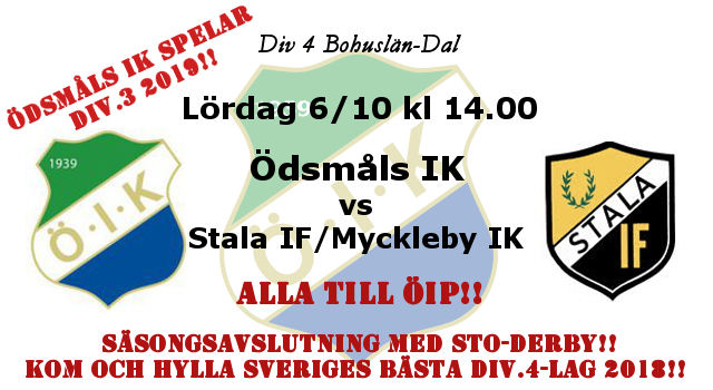Dagen är kommen.. det är dags att avsluta en fantastisk och helt magisk säsong. Man kan säga så mycket om detta lag och hur de spelar.. deras fokus på uppgiften.. deras vilja att gå hela vägen denna säsong och hur de har visat för publiken hur vacker fotboll komponeras! Hatten av för alla spelare och ledare, vi tackar för showen! Det är alltså dags för sista matchen för denna säsongen och vi laddar då för ett STO-derby mot Stala IF/Myckleby IK. Kan det bli bättre? Tror inte det! Laget har ju sedan några omgångar redan skrivit klubbhistoria med att färga platsen i div.3 2019 grönvit. Inte mycket spänning kvar inför denna sista omgång eller? Men det finns det faktiskt.. till och med två saker som gör denna sista match så spännande!! För det första har laget möjlighet att gå genom serien helt obesegrade om man sköter sina kort rätt i denna match, alltså 22 av 22 matcher utan förlust, mycket starkt och imponernade!! Inget unikt för årets div.4-serier i Sverige iofs.. Men det stoppar inte där.. vid vinst kommer man gå genom serien utan ett enda tappat poäng.. det är smått otroligt och unikt på denna nivå och tittar vi på de 35st div.4-serier vi har i Sverige är det ingen serieledare som kommer i närheten av denna bedrift! Återigen hatten av till laget! Vi kan faktiskt redan innan denna match utnämna laget till Sveriges bästa div.4-lag säsong 2018!! Stort grattis killar!! Välkomna till fotbollsfest på Ödsmåls IP nu på lördag Match: Ödsmåls IK - Stala IF/Myckleby IK Tid: Lördag 6 oktober 14.00 Plats: Ödsmåls IP Entréavgift: 50 kr Medlem och pensionär: 30 kr 0-16 år eller aktiva spelare i ÖIK: fri entré Vi önskar alla välkomna till Ödsmåls IP för att njuta av vacker fotboll och heja fram vårt herrlag!! Sveriges bästa div.4-lag 2018!! Påminner besökare till matchen som kommer med bil att åka förbi anläggningen och parkera på anvisad plats på vår grusplan! Följ skyltarna!