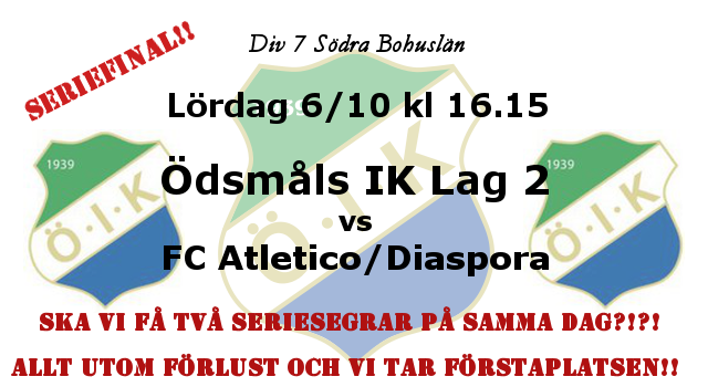 Detta kan bli en säsong som faktiskt slutar i två seriesegrar för våra två seniorlag!! Hur häftigt är inte det?! Vårt andralag på herrsidan har allt i sina egna händer och denna match är en ren seriefinal utan att några andra lag kan lägga sig i toppstriden. Förutsättningarna är otroligt enkla.. allt utom förlust i denna sista match gör att vi även tar förstaplatsen i Div.7 Södra Bohuslän 2018!! Välkomna till fotbollsfest på Ödsmåls IP.. det kan bli en historisk dag att minnas!! Match: Ödsmåls IK - FC Atletico/Diaspora Tid: Lördag 6 oktober 16.15 Plats: Ödsmåls IP Påminner besökare till matchen som kommer med bil att åka förbi anläggningen och parkera på anvisad plats på vår grusplan! Följ skyltarna!