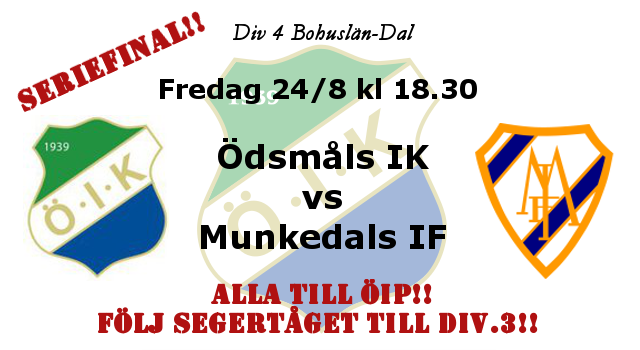 Herrarnas segertåg rullar vidare i allt högre fart.. 15 segrar av 15 möjliga är hittills bärgade med en målskillnad på hela +49 mål! HELT GALET!! Nu tar laget emot serietvåan Munkedals IF i en tidig seriefinal hemma på Ödsmåls IP. En serietvåa som ligger 11 poäng efter och ska nu det berömda halmstrået greppas av serietvåan så är det i just denna match. Men vi hoppas och tror starkt på att detta blir herrarnas 16:e raka seger och föreningen hoppas nu att alla tar sig upp till ÖIP och visar laget stödet och uppskattning från läktare och runt planen! Vi ska till 3:an!! Inget snack!! Match: Ödsmåls IK - Munkedals IF Tid: Fredag 24 augusti 18.30 Plats: Ödsmåls IP Entréavgift: 50 kr Medlem och pensionär: 30 kr 0-16 år eller aktiva spelare i ÖIK: fri entré Vi önskar alla välkomna till Ödsmåls IP för att njuta av vacker fotboll och heja fram vårt herrlag till ännu en ny seger!! Vi vill påminna besökare till matchen som kommer med bil att åka förbi anläggningen och parkera på anvisad plats på vår grusplan! Följ skyltarna!