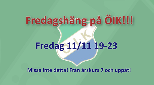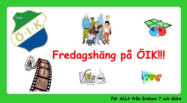 Alla ungdomar fr o m sjunde klass är välkomna till ÖIK på fredag 11/11 mellan kl 19-23! Där kommer finnas café, pingisbord med pingisrobot, musik, kompisar samt eventuellt Sveriges VM-kval match i fotboll på projektor. Då detta är helt ideellt är ungdomarna där på eget ansvar men det kommer finnas vuxna på plats under hela kvällen. Hoppas att så många som möjligt vill komma och ha en rolig kväll tillsammans på ÖIK! /Fredagsgruppen