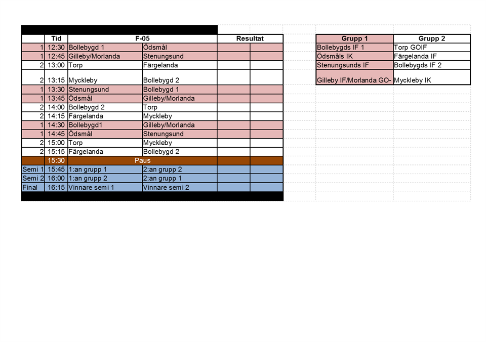 Nu på söndag är det dags att ta färjan över vattnet och delta i Myckleby Cup!! Tjohoo!! Vi samlas på ÖIP kl 11.00 och åker sedan för att ta färjan 11.18 från Kolhättan. Glöm inte ta med inomhusskor för fotboll, benskydd, vattenflaska, tofsar. Vi önskar även att ni tar av er halsband och örhängen redan hemma så slipper vi risken med att de tappas bort. Vi byter om på plats och vi duschar efter vi har spelat färdigt våra matcher. Har tyvärr inte fått någon info om det finns någon kiosk i hallen så vi skulle önska att ni tar med er en lättare lunch hemifrån och att vi gemensamt käkar denna efter första matchen. Glöm inte att ta med frukt/fika så att vi alla orkar hålla igång och spela alla matcher. Sk energibars är okej men bör undvikas pga sockerhalten. Godis äter vi helst inte mellan matcherna! OBS!! INGA citrusfrukter för medtagas till hallen då en deltagare har svår citrusallergi. Blir vi etta eller tvåa i gruppen så går vi vidare till finalspelet. Vårt spelschema 12.30 Bollebygd 1 - Ödsmåls IK 13.45 Ödsmåls IK - Gilleby/Morlanda 14.45 Ödsmåls IK - Stenungsunds IF Finalspel 15.45-16.30 Har säkert glömt något men det får räcka för nu. Kommer vi på något eller ni har någon fråga.. skriv i kommentarsfältet här nedan!! Vi ses på söndag!! //Jonas