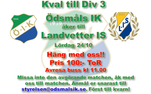Imorgon är det dags för sista och helt avgörande matchen i kvalet till div 3 och killarna åker till Landvetter för att bärga en seger och dessutom bättre målskillnad än vad IFK Åmål lyckas med mot Alingsås. Nu finns det möjlighet att åka med i bussen till och från matchen för att se och hejja fram killarna. Priset för resan tur och retur är endast 100kr! (priset gäller endast bussresan) Avresa 24/10 kl 11.00 från Ödsmåls IP (Avspark kl 14.00) Antal platser är begränsat så först till kvarn gäller! Anmälan sker till styrelsen@odsmalsik.se eller direkt till någon i styrelsen/seniorlaget.