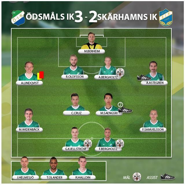 Trots att vi vände och vann STO-derbyt mot Skärhamns så fanns tankarna efter matchen på något helt annat. Med 15 minuter kvar av matchen ramlade Mauritz Saengsri ihop och fick föras med ambulans till sjukhuset. Krya på dig Mod, vi tänker på dig! Matchen hade knappt hunnit börja förrän första målchansen skapas. Martin Widenbäck får ett bra läge men skottet täcks precis när han ska avsluta. Efter detta vaknar Skärhamn till och är det bättre laget under större delen av halvleken. Vi slår bort bollar och kommer inte åt dom med i pressen. I 14:e matchminuten tar Skärhamn ledningen efter att Jakob Thoren når högst på en hörna och distinkt nickar in 1-0. I 39:e matchminuten får Skärhamn frispark en bit utanför straffområdet. Berheim räddar men på returen dyker Hugo Wolfbrandt upp och sätter dit 2-0. I slutet av första halvlek spelar vi bättre och får mer att säga till om. Vi får också utdelningen på av de många hörnorna vi skapar. Precis innan halvtid nickar Adam Bergholtz in reduceringen 1-2 när han tämligen ostört får gå upp och trycka dit den, nu kändes det som att vi fick luft under vingarna! Andra halvlek är endast 5 minuter gammal när Gustav Kjellström från nära håll skjuter in kvitteringen, 2-2. Nu blir det ombytta roller jämfört med första halvlek. Skärhamn är passiva medan vi är det piggare laget. I 65:e matchminuten tappar Skärhams målvakt bollen, Andreas Astegren snappar upp den och spelar snett innåt bakåt till Filip Bergholtz som sätter dit 3-2. Skärhamn får ett bra läge till kvittering vid en omställning. Efter att bollen studsat kors och tvärs så blir Marcus Kristiansson fri men denne får inte till avslutet. Vi försvarar oss framgångsrikt och skapar flera chanser till att avgöra matchen men utan att lyckas. Det skulle krävas en utvisning för att Skärhamn skulle skapa lite tryck. Med 5 minuter kvar drar Andreas Lindqvist på sig sitt andra gula kort. Skärhamn skapar några lägen i slutet men matchen slutar 3-2.