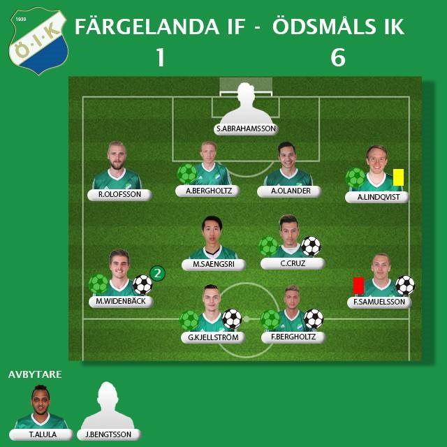 Ödsmål stod igår för en mycket stabil insats när Färgelanda besegrades med 1-6 på Högalid IP. Med undantag för 15 minuter i början av andra halvlek spelar vi fin anfallsfotboll kombinerat med ett stabilt försvarsspel. Samtliga tar jobbet men framförallt så spelar vi bollen till spelare i bättre läge än oss själva vilket också gjorde att vi kunde göra sex mål. Redan efter 2 minuter springer Martin Widenbäck sig fri på kanten efter passning av Andreas Lindqvist, Martin gör inget misstag utan sätter den till höger om målvakten, 0-1 och en smakstart. Det känns som vi har bra koll på dom samtidigt som vi känns giftiga framåt. 10 minuter in i matchen tar Filip Samuelsson vara på en målvaktsretur och trycker in 0-2. I 26:e matchminuten springer återigen Martin Widenbäck sig fri på kanten, denna gången serverad av Robin Olofsson, Martin gör inget misstag utan skjuter in bollen via stolpens insida, 0-3. Sista 20 höjer Färgelanda upp sig något utan att skapa någon målchans. Vi spelar forsatt fin fotboll och hotar ständigt Färgelandas backlinje. Bl.a. har Filip Bergholltz en boll i nät som blir bortdömd för offside. 0-3 i halvtid. I pausen prata vi om att fortsätta behålla fokus och inte släppa in något mål första 10 minuterna. Detta lyckades vi inte alls med. Färgelanda kommer ut som ett nytt lag med mycket energi samtidigt som vi är passiva. Det dröjer bara tre minuter tills reduceringen kommer. Felix Ljung i Färgelanda tar sig, på ett allt för enkelt sätt , förbi tre spelare och chippar kyligt in bollen i mål bakom vikarierande Stefan Abrahamsson. Nu fick Färgelanda vittring. 5 minuter senare skapar man ytterligare en farlig chans som Stefan gör en bra räddning på, mål där och matchen hade kunnat ta en helt annan vändning. För istället för ytterligare reducering utökar vi vår ledning. Martin Widenbäck slår ett inlägg som Gustav Kjellström når högst på och knoppar in 1-4. Luften går ur Färgelanda och nu känns matchen avgjord. Vi trummar på och i 72:a matchminuten serverar Cristobal Cruz Filip Bergholtz som fri med målvakten sätter dit 1-5. Tyvärr åker Filip Samuelsson på ett rött kort två minuter senare. Det hindrar oss dock inte från att göra ytterliggare ett mål. Filip Berholtz tar sig runt på vänsterkanten och bjuder denna gången tillbaka genom att passa Cristo som placerar in 1-6. Färgelanda har även de några chanser i slutet av matchen men 1-6 blir slutresultat. Ett stort plus till samtliga som deltog och ett extra tack till Stefan som ställde upp i målet. Nu laddar vi om för matchen mot Kungshamn som spelas nästa söndag (6/7) på ÖIP. Avspark 16.00.