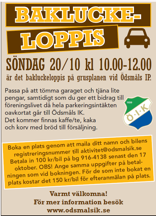 Du har väl inte glömt att boka plats? Ödsmåls IK arrangerar BAKLUCKELOPPIS SÖNDAGEN den 20 OKTOBER, kl 10-12 på ÖDSMÅLS IP - grusplanen Det finns platser kvar! Boka plats med ett mail till aktivitet@odsmalsik.se, ange ditt namn och bilens registreringsnummer. Betala 100 kr/bil till Ödsmåls IK's bankgiro 916-4138 senast den 17 oktober, märk betalningen med Bakluckeloppis och ange ditt namn och bilens registreringsnummer. Mer information hittar du även till vänster, AKTIVITETER 2013 och BAKLUCKELOPPIS. VÄLKOMNA! Ödsmåls IK